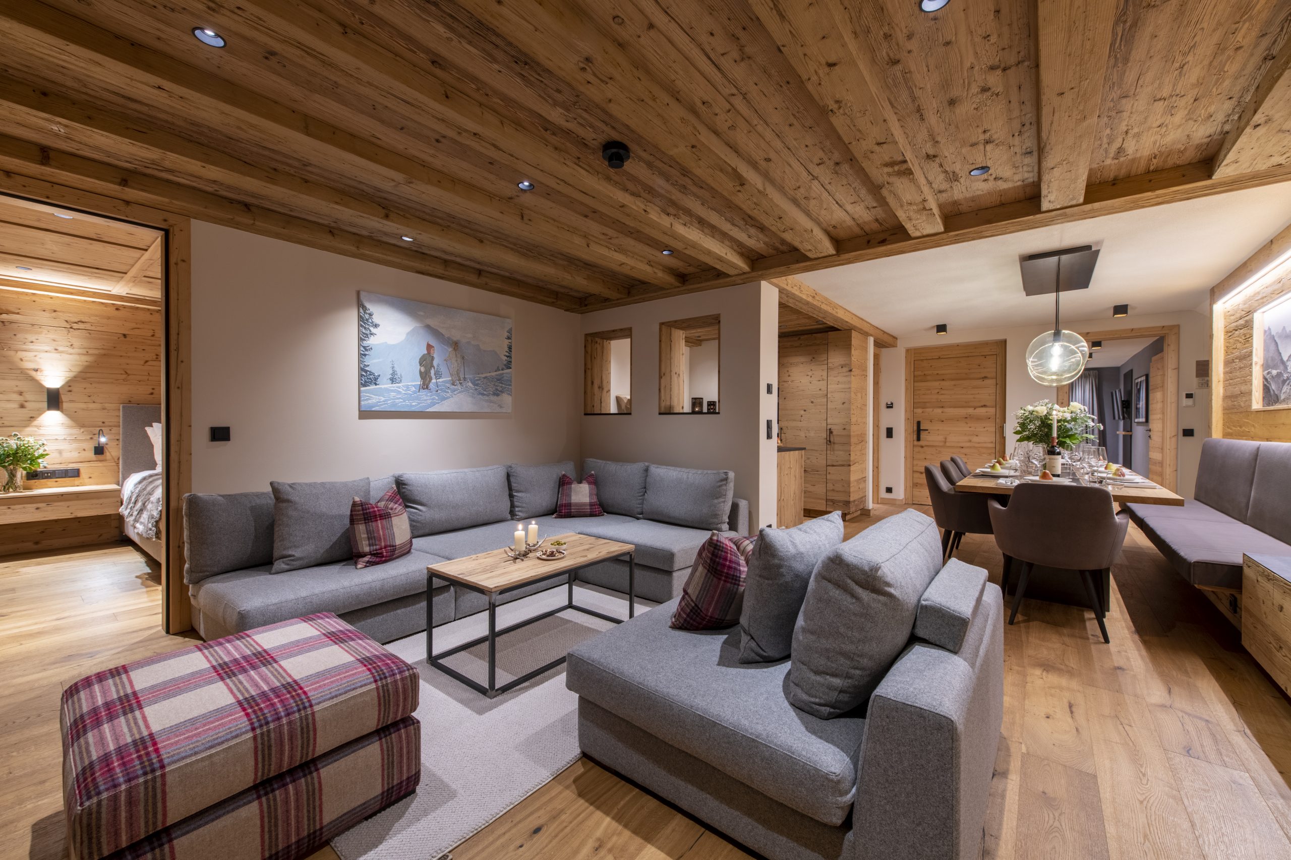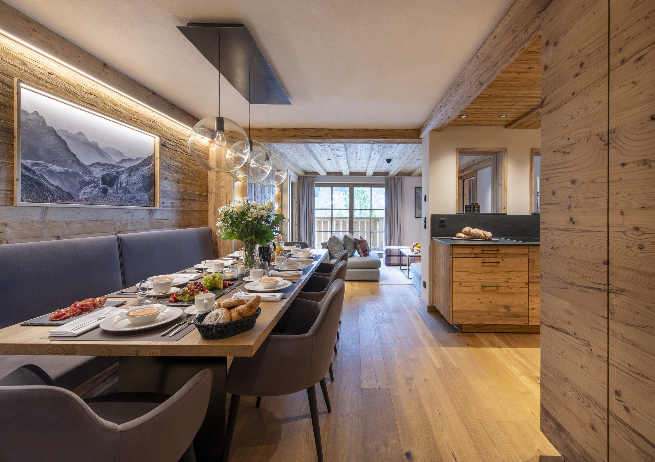Sleeping 8+2 across four beautifully finished bedrooms, Apartment 10 is a fantastic option for a family or friend group wanting an authentic yet modern Alpine escape. The interior is decorated with aged woods and soft textiles, accented with plaid patterns and nods to traditionalism. The fully-equipped kitchen has an open plan design leading out to the 10-seater dining area, ideal for entertaining. After dinner, lounge in front of the fireplace in winter, or enjoy a late summer sunset on the balcony overlooking Lech.